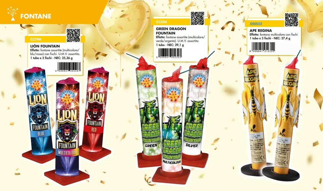 SPETTACOLO BORGONOVO FONTANA APE REGINA PRODOTTO DISPONIBILE IN SEDE €0,00 0,00 Acquista APE REGINA Effetto: fontana multicolore con fi schi 1 tubo e 3 fi schi - NEC: 27,4 g