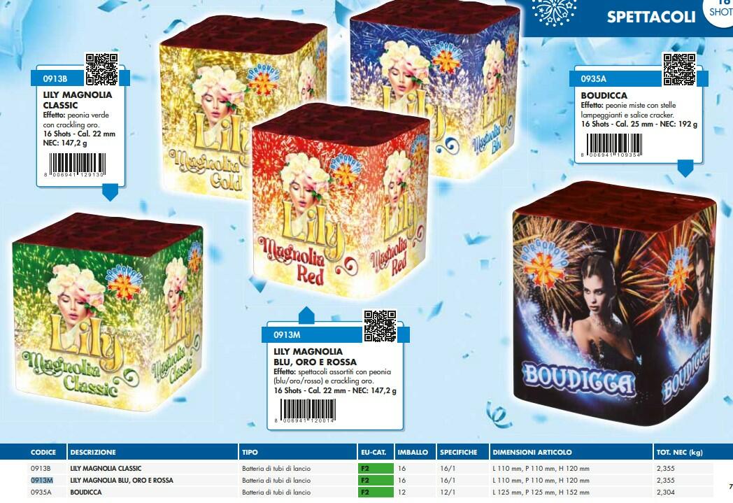 SPETTACOLO BORGONOVO LILY MAGNOLIA CLASSIC PRODOTTO DISPONIBILE IN SEDE €0,00 0,00 Acquista LILY MAGNOLIA CLASSIC Effetto: peonia verde con crackling oro. 16 Shots - Cal. 22 mm NEC: 147,2 g